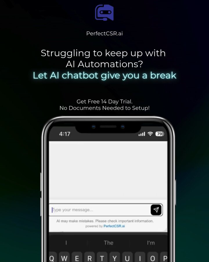 Build your AI chatbot in 10 minutes. No documents. No setup calls. No tech team. Just smart, instant customer support powered by PerfectCSR.ai #AIChatbot #CustomerSupportAutomation #PerfectCSR #ConversationalAI #BusinessGrowth #ChatbotForBusiness #NoCodeAI