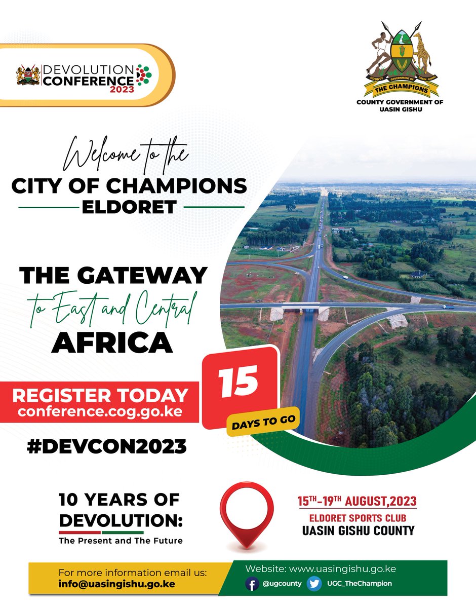 Welcome to the City of Champions, the gateway to East and Central Africa! Register today on conference.cog.go.ke 15 days to go. #DEVCON2023 #KARIBUELDORET