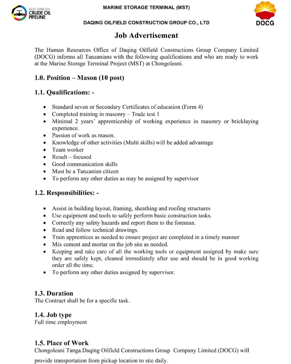 𝐉𝐎𝐁 𝐎𝐏𝐏𝐎𝐑𝐓𝐔𝐍𝐈𝐓𝐈𝐄𝐒 #EACOP's contractor #DOCG is looking for 10 Masons to work at the Marine Storage Terminal Project (MST) at Chongoleani. #Tanzania #LocalContent DETAILS 👉bit.ly/EACOP_DOCG