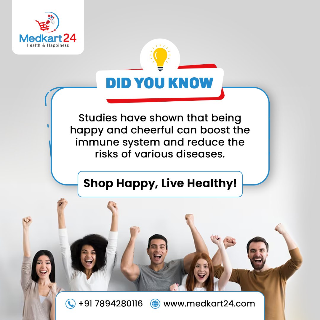 Did you know? Your laughter isn't just music to our ears, it's a symphony for your immune system! 😄🎵 Science says happiness is the best medicine. Shop with us at Medkart24 and make health a joyful journey! #ShopHappyLiveHealthy #dailyfunfacts #healthfacts #Medkart24