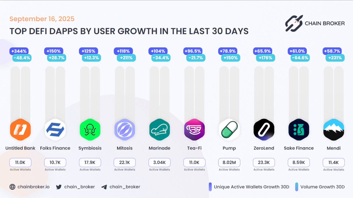 👀 TOP DEFI DAPPS BY USERS GROWTH IN THE LAST 30 DAYS @BankUntitled +344% @folksfinance +150% @symbiosis_fi +125% @MitosisOrg +118% @MarinadeFinance +104% @TeaFi_Official +96.5% @pumpdotfun +78.9% @zerolendxyz +65.9% @sakefinance +61.0% @MendiFinance +58.7% #DeFi #dApps $SIS…