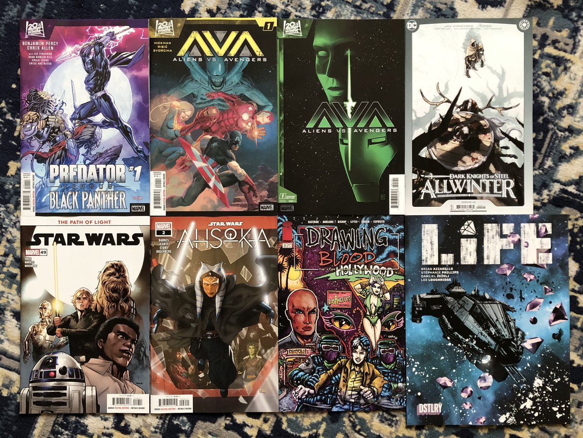This week’s pull. #PredatorVersusBlackPanther #AliensVsAvengers #DarkKnightsOfSteelAllwinter #StarWars #Ahsoka #DrawingBlood #Life #Comics #ComicBooks #PullListWorthy
