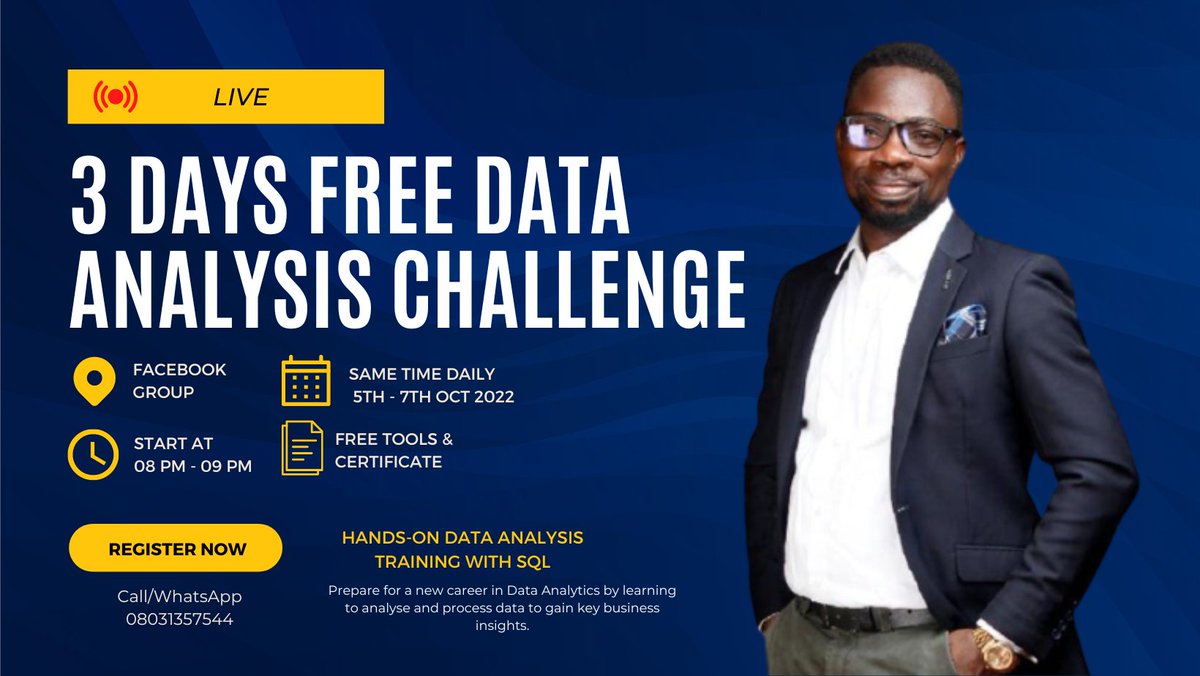 Sign up today! and join NOW! bit.ly/3SqhcxP Time: 8pm - 9PM WAT Date: 5th - 7th, Oct, 2022 #3daysfreedataanalysischallenge #dataanalysiss #datasciencetraining #datascienceenthusiast #datasciencecourse #datascienceprojects #datascience #dataanalytics #DataAnalyticsJobs