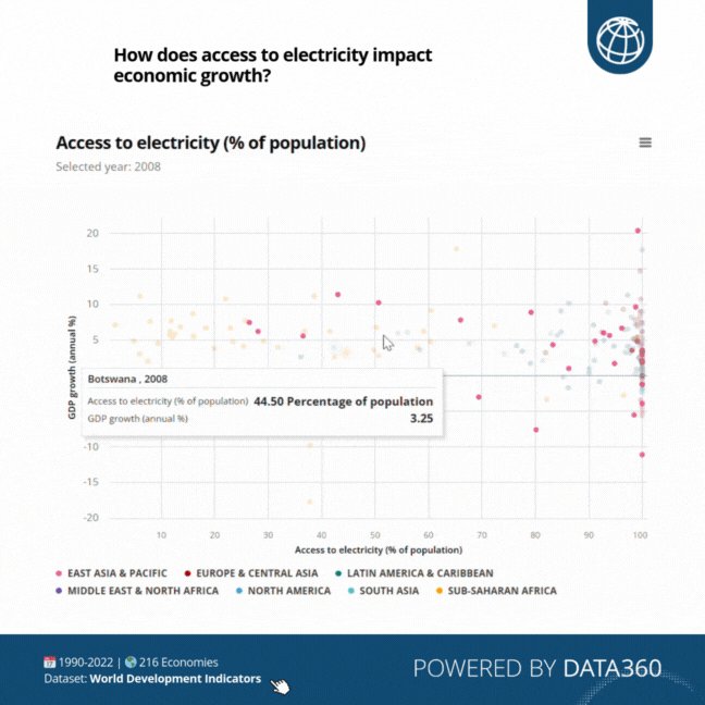 Curious how GDP growth đ and access to electricity âĄď¸ are connected across countries? With #Data360, you can explore this link and uncover insights to drive better decisions: wrld.bg/oV3W50VNitj #DataMeetsDevelopment