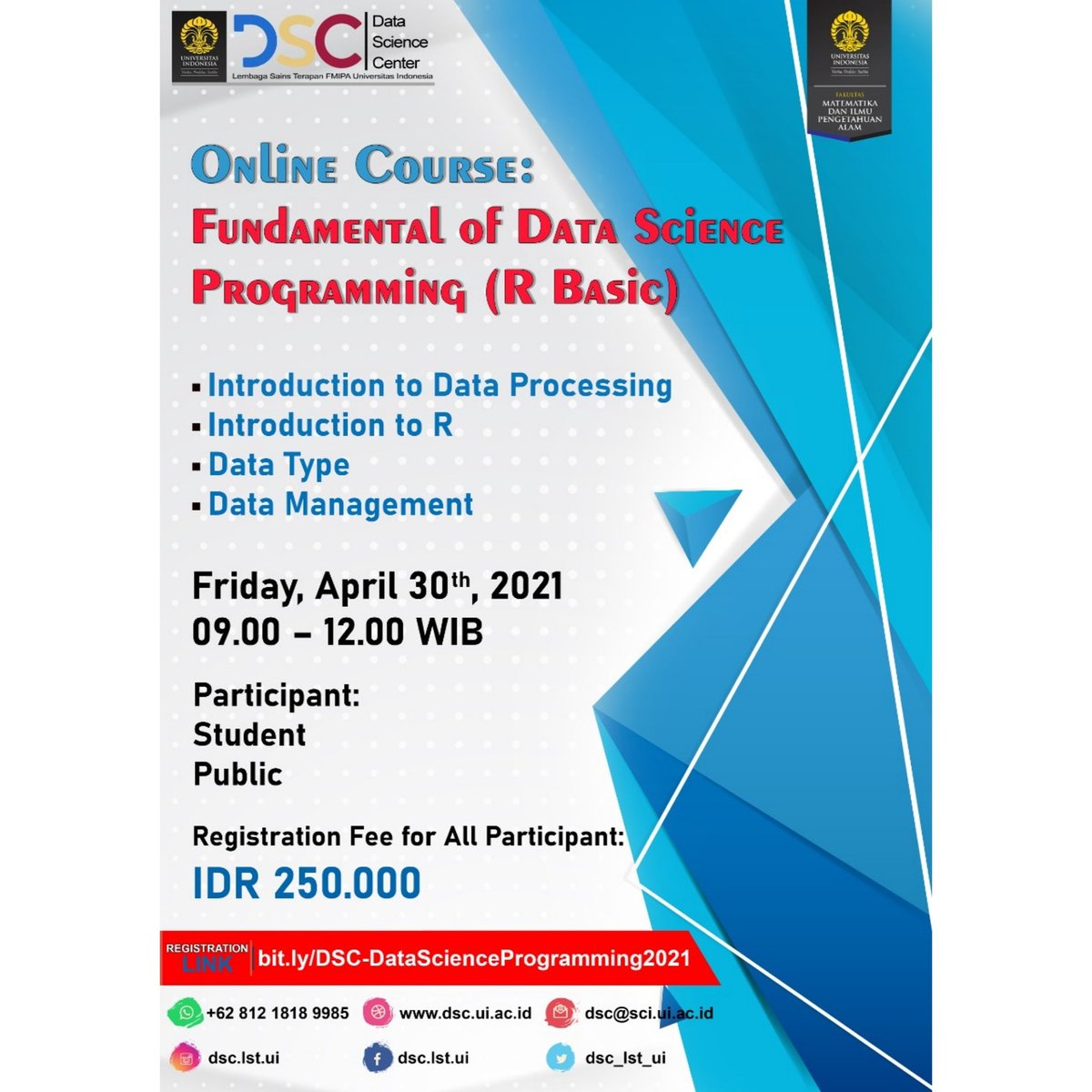 Hallo.. Sobat Data.. Data Science Center (DSC) LST FMIPA UI will held online course "Fundamental of Data Science Programming (R Basic)" on Friday, April 30th, 2021 Please join with us by following this link: bit.ly/DSC-DataScienc… #datascienceprogramming #rbasic #onlinecourse