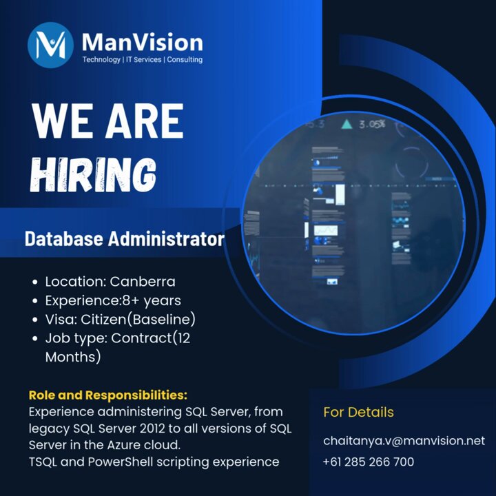 Database Admin role in Canberra open for experienced professional with 8+ years of expertise. Requires citizenship and Baseline clearance. Manage SQL Server & migrate to Azure cloud. Contact [email protected] | +61 285 266 700. #CanberraJobs #DatabaseAdmin