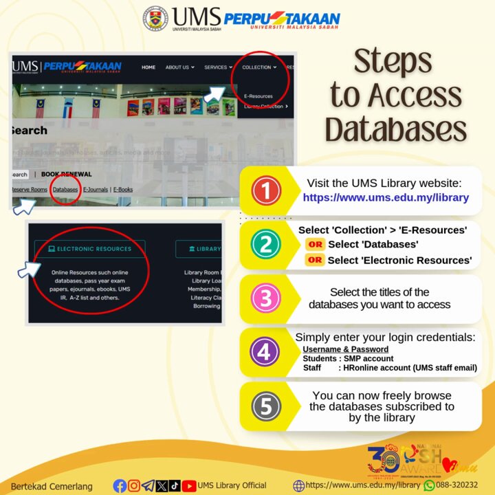 SIMPLE STEPS TO ACCESS THE LIBRARY DATABASE UMS library website provides easy access to various databases. Just log in via our website at ums.edu.my/library to access the resources you need. Happy Exploring!😉 #DatabaseCollection #SharingKnowledge #UMSLibrary