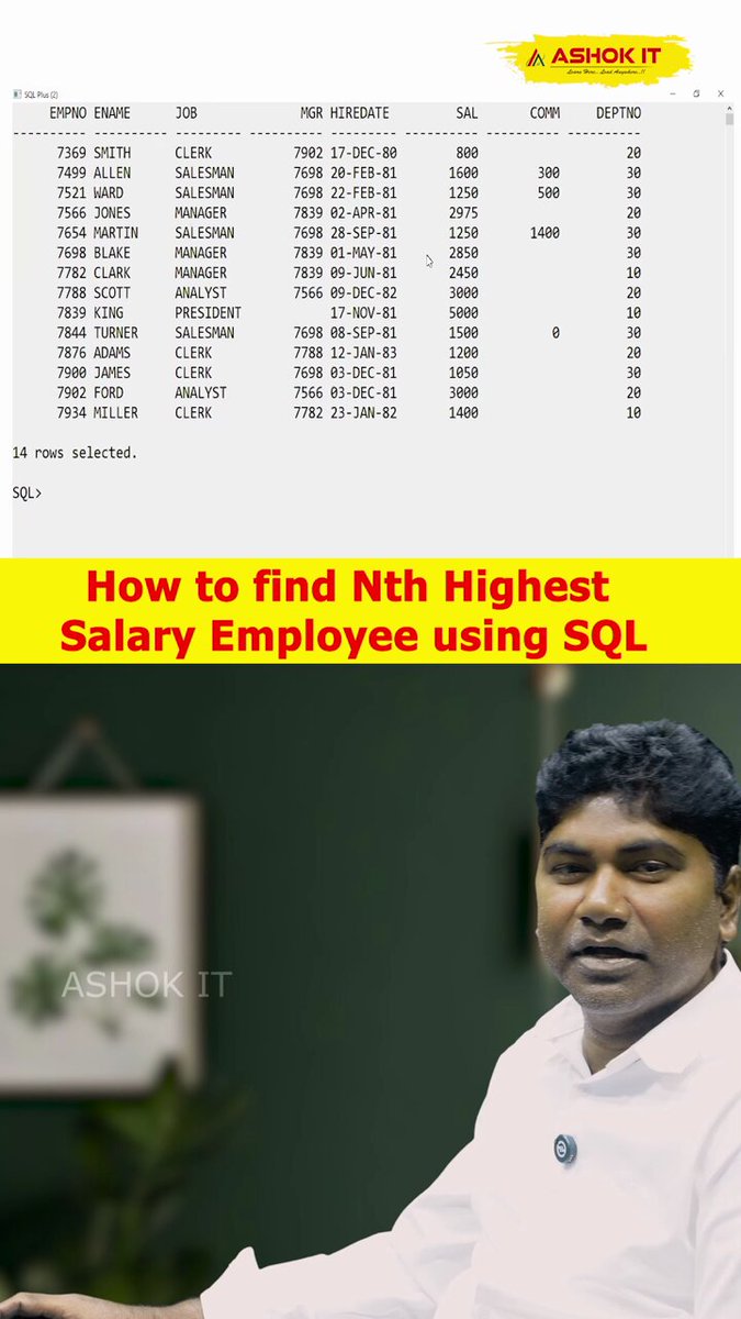 💡 SQL Interview Question: 👉 How do you find the Nth Highest Salary in a table? (Super important for SQL + Backend + Java interviews!) . 📩 DM us today | 📷 Visit: ashokit.in/courses/java-f… . #SQLInterviewQuestions #SQLQueries #DatabaseDeveloper #SQLTips #NthHighestSalary #MySQL