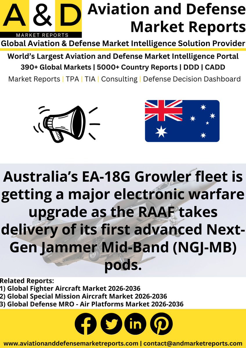 The RAAF's EA-18G Growler fleet just got a massive upgrade! The first Next Gen Jammer Mid-Band (NGJ-MB) pods have arrived to actively disrupt enemy radar and boost aircrew survivability. To know more click: aviationanddefensemarketreports.com/product/global… #RAAF #DefenseTech #AviationNews