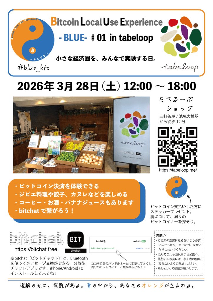 本日3/28(土)12-18時、三宿のたべるーぷさんで、ビットコイン決済イベントを行います。分からない事はきっとオレンジ&ブルーのステッカーを胸に付けたビットコイナーが教えてくれるはず。bitchatで繋がろう‼️ #blue_brc #diamondhands #ビットコイナー反省会 #bitcoin maps.app.goo.gl/eUy4xEAZ1P2vYG…