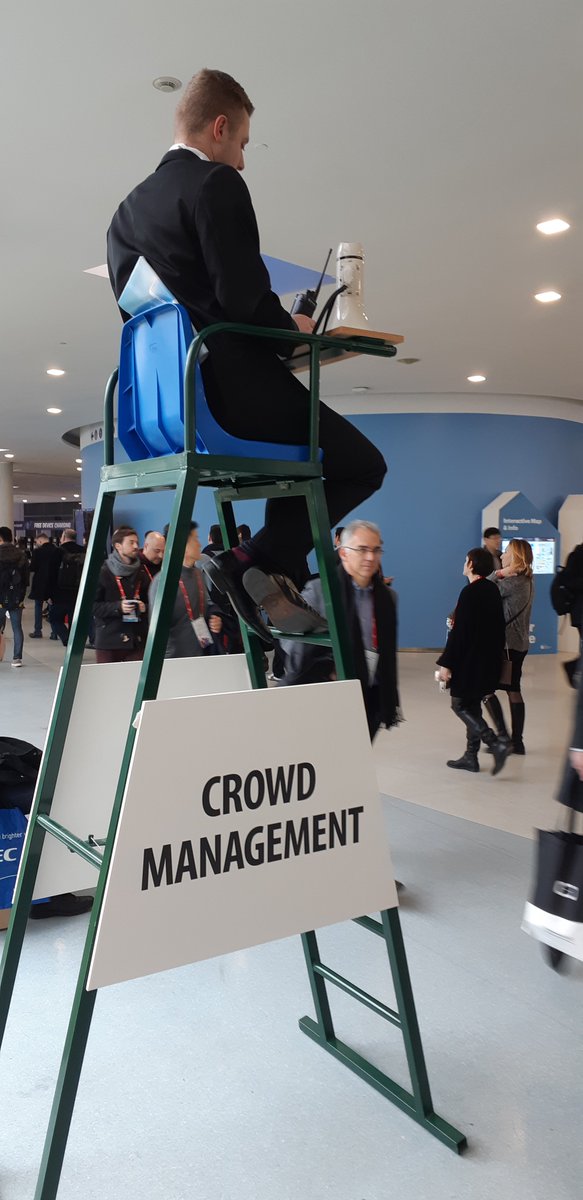 On a beau vivre dans un monde numérisé : rien ne vaut un agent de la circulation armé d'un mégaphone pour réguler activement les déplacements des visiteurs du #MWC2018 Une autre manière de sécuriser la mobilité 😉 #DigitalButHuman