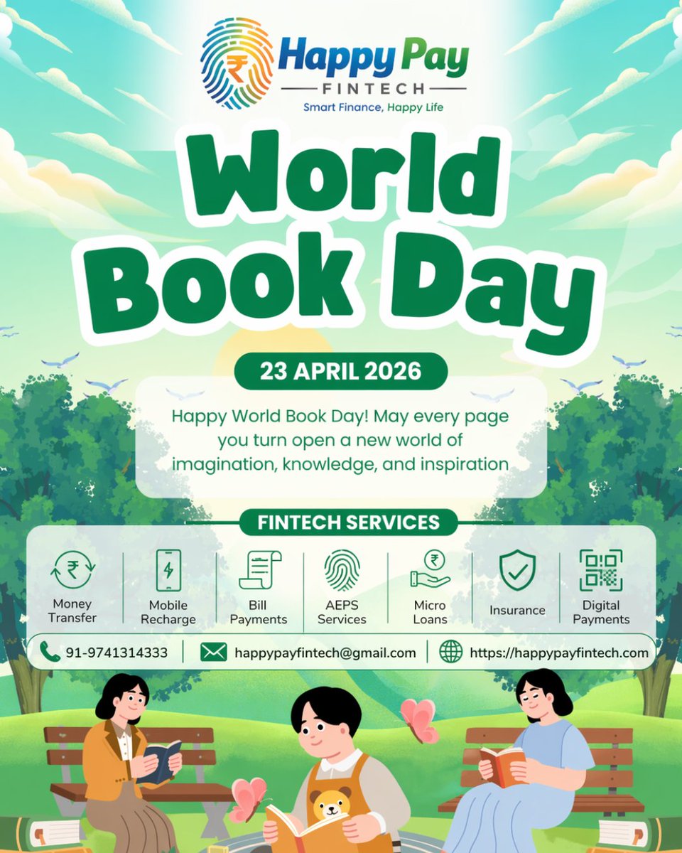 Happy World Book Day! Turn every page into opportunity & growth with HappyPay Fintech 💡 💸 Money Transfer | 📱 Recharge | 🧾 Bills | 🏦 AEPS | 💰 Loans | 🛡 Insurance 📞 91-9741314333 🌐 happypayfintech.com #WorldBookDay #Fintech #DigitalPayments #India