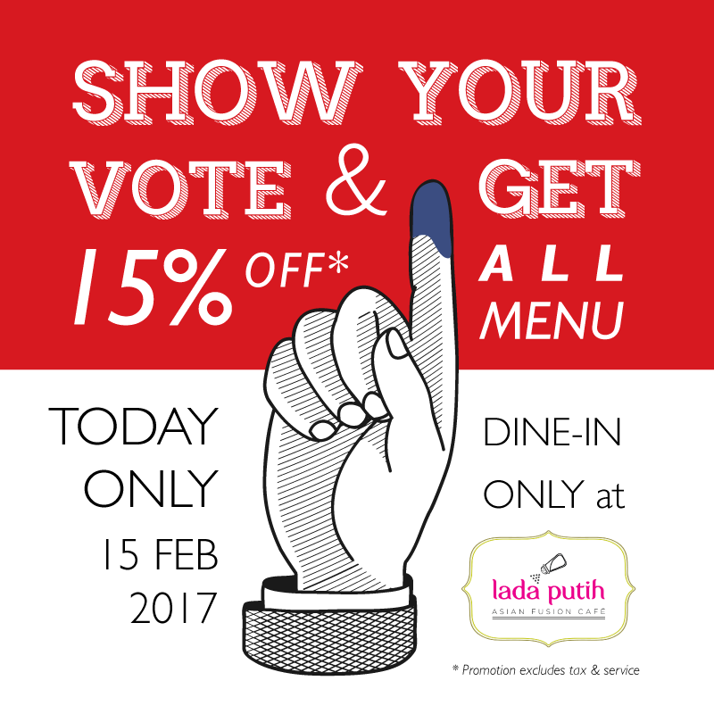 Show your vote & get 15% off all menu*, 1 day only, 15th Feb 2017 & dine-in only ! #diskonpilkada #jakartapilkada #PilkadaSerentak2017