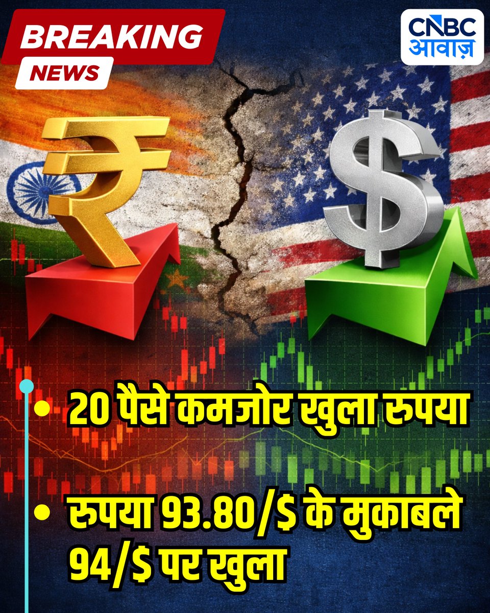 #DollarvsRupee | 20 पैसे कमजोर खुला रुपया ▶️रुपया 93.80/$ के मुकाबले 94/$ पर खुला #Dollar #Rupee #Forex