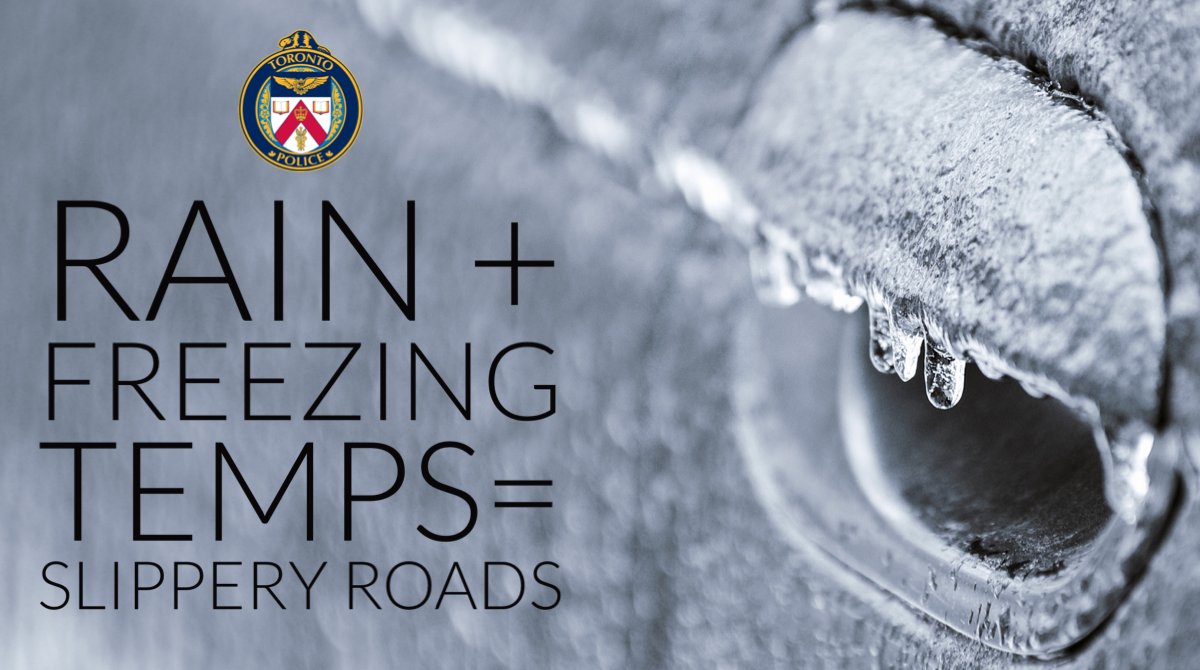 When you mix rain and freezing temperatures you get the risk of slippery roads. Be prepared for a slower drive, Toronto. Slow down and leave extra space. Let's work together for a safer drive to work and home again. @TPSMyronDemkiw @BausJacqueline #RoadSafety #DriveSafeToronto