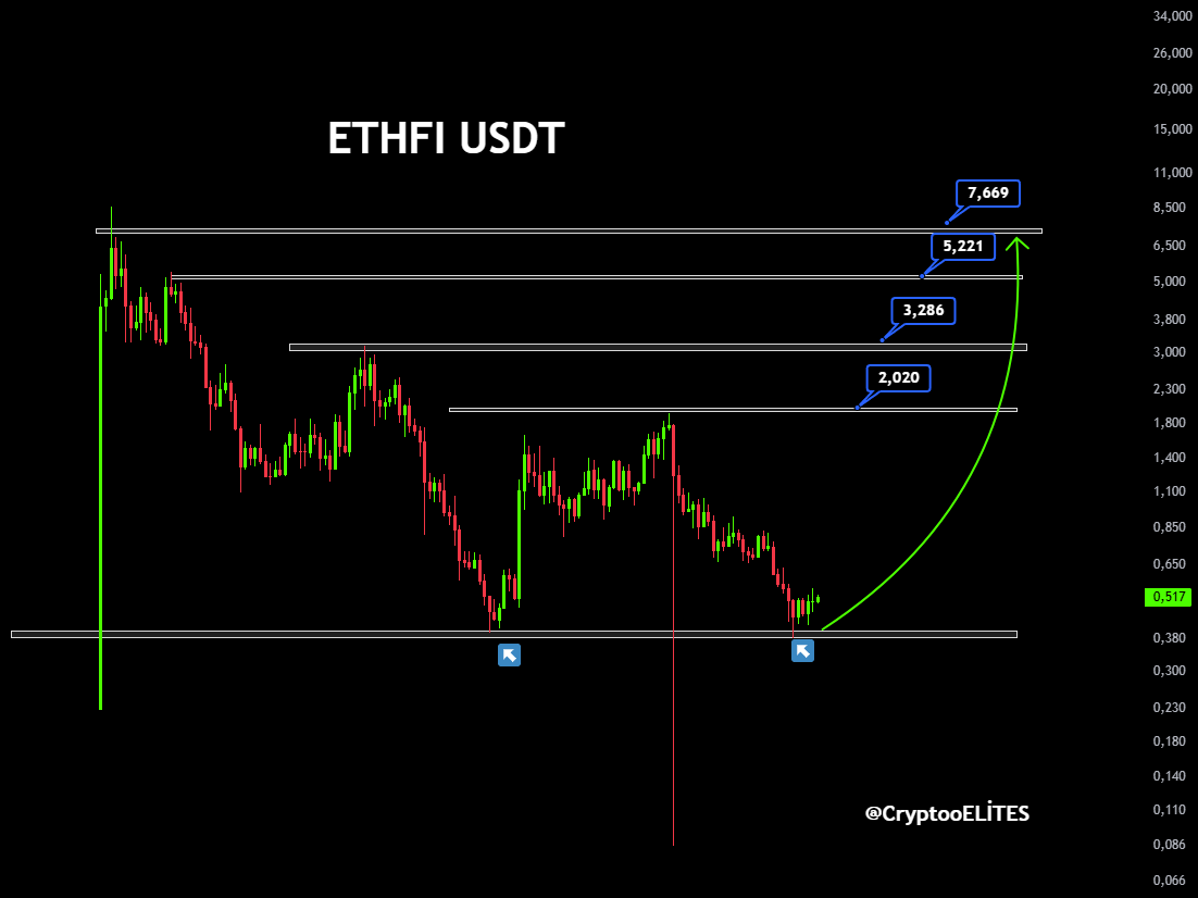 #ETHFI tarafında taşlar yerine oturuyor mu? Grafiğe bakınca, fiyatın o çok kritik "dip" bölgesinden (mavi oklar) aldığı güçle yeni bir döngüye hazırlandığını görmek zor değil. Mevcut seviyelerden (0,517) başlayacak bir kavisli toparlanmanın (yeşil ok) önündeki Fibonacci