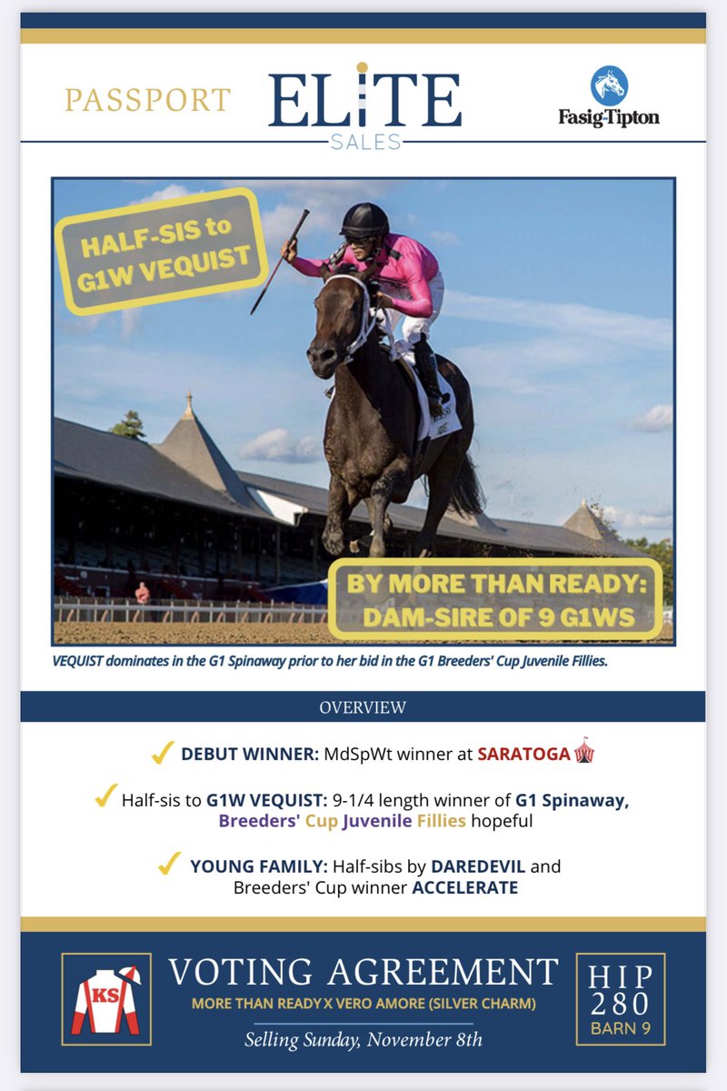 That’s what we call an #ELiTEupdate! Her 1/2 sister VOTING AGREEMENT (More Than Ready) ships to @FasigTiptonCo this evening to sell Sunday at the Night of the 🌟 as Hip 280! Come find the 1/2 sister to @BreedersCup Juvenile Fillies winner Vequist tomorrow morning in Barn 9!
