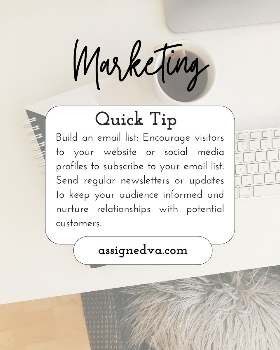 Building an email list is like cultivating a garden of potential customers. 🌱 📧🌟 With regular newsletters, you'll nurture strong relationships and keep your audience engaged. Let's grow your business together! #MarketingMagic #EmailListSuccess #AssignedVA