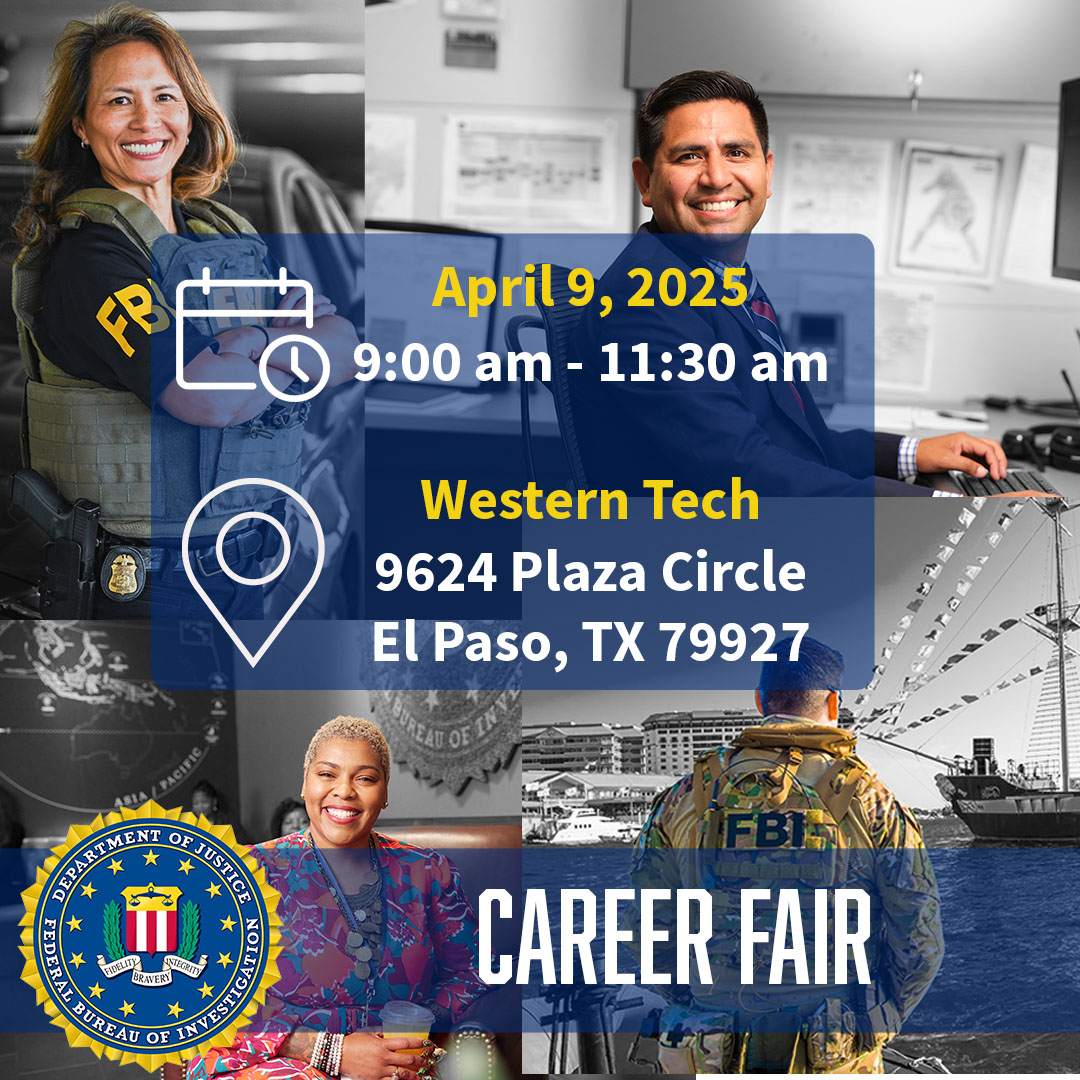If you're interested in a career with the #FBI, stop by the #FBIEP booth at the @wtcep Career Fair on April 9th! We'd love to meet with you and answer any questions you may have! Take a look at fbijobs.gov and see what interests you!