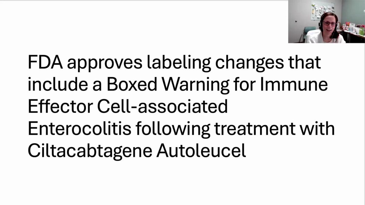 ⚠️ Dr. Doris Hansen from Moffitt discusses the new #BoxedWarning added to cilta-cel for immune effector cell-associated enterocolitis in myeloma. Watch the full video on #VuMedi: tinyurl.com/yt7vy2wf #FDAUpdate #SafetyUpdate #DrugSafety #HemOnc #MMSM #MedTwitter