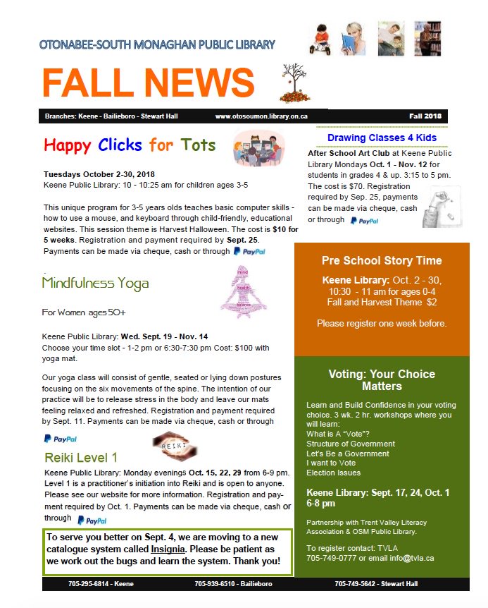 What's happening at OSM Public Library? #fallnewsletter #osmpubliclibrary #osmtownship #reiki #yoga #VotingMatters #storytime #happyclicksfortots #drawingclasses