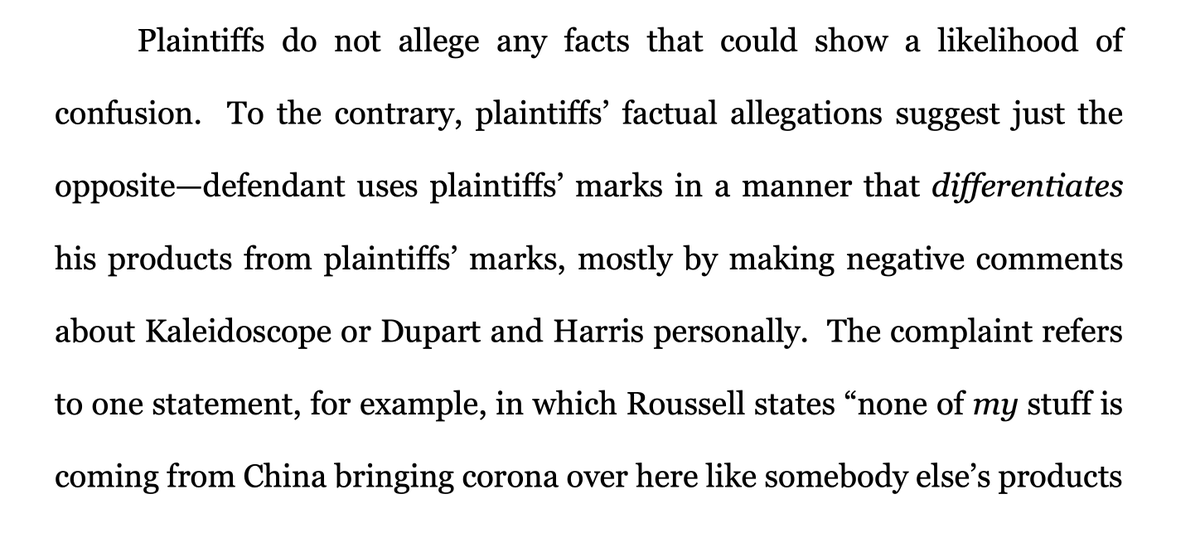 Remarks disparaging πs & their cosmetic products aren’t subject to #trademark claim b/c ∆ emphasized how diff. the products were. But #FalseAdvertising & #FalseDesignation claims go forward. business.cch.com/ald/DUPARTvROU… /1