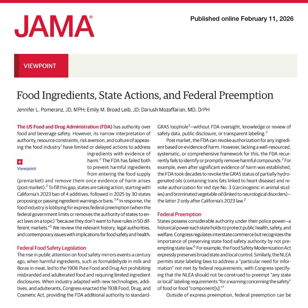 💬 Viewpoint: Federal food safety laws set national standards but preserve state authority to ban harmful ingredients and require warnings. State actions help fill gaps in #FDA oversight. ja.ma/4b68pg9