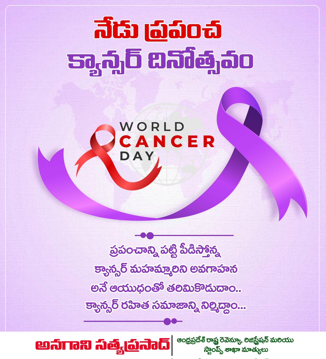ప్రపంచ క్యాన్సర్ దినోత్సవం సందర్భంగా క్యాన్సర్ గురించి ప్రతి ఒక్కరం అవగాహన పెంచుకుందాము. తగు జాగ్రత్తలు తీసుకుంటూ ఆరోగ్యంగా ఉందాం. #WorldCancerDay #Feb4th