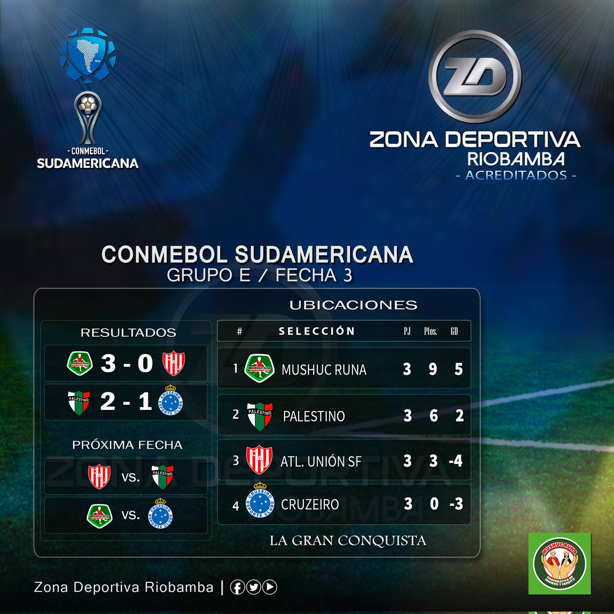 @Sudamericana ¡𝙇𝘼𝙎 𝙐𝘽𝙄𝘾𝘼𝘾𝙄𝙊𝙉𝙀𝙎! #FaseDeGrupos Cumplida la #FechaTRES del #GrupoE, así las posiciones en la fase de grupos de la #ConmebolSudamericana. ☑ #Grupo_E #MushucRunaSC 🇪🇨 #Cruzeiro 🇧🇷 #Palestino 🇨🇱 #AtléticoUnión 🇦🇷 @mushucrunacoac Informa: #JimmyRoldán