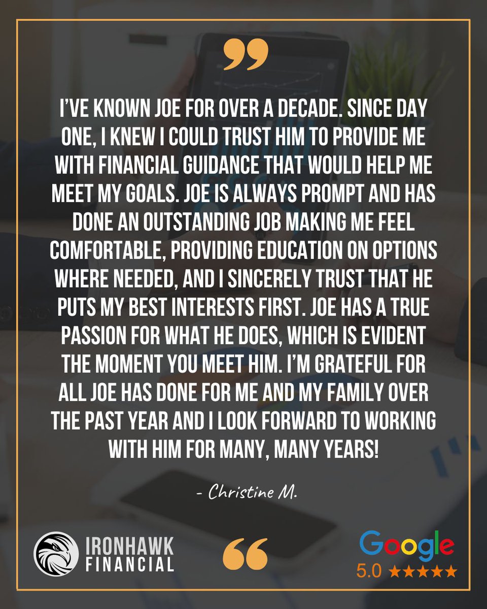 Trust, education, and putting clients first — that’s the Ironhawk Financial difference. 🦅💼 Thank you, Christine, for sharing your experience and trusting Joe with your family’s financial goals! #IronhawkFinancial #FinancialGuidance #WealthProtection