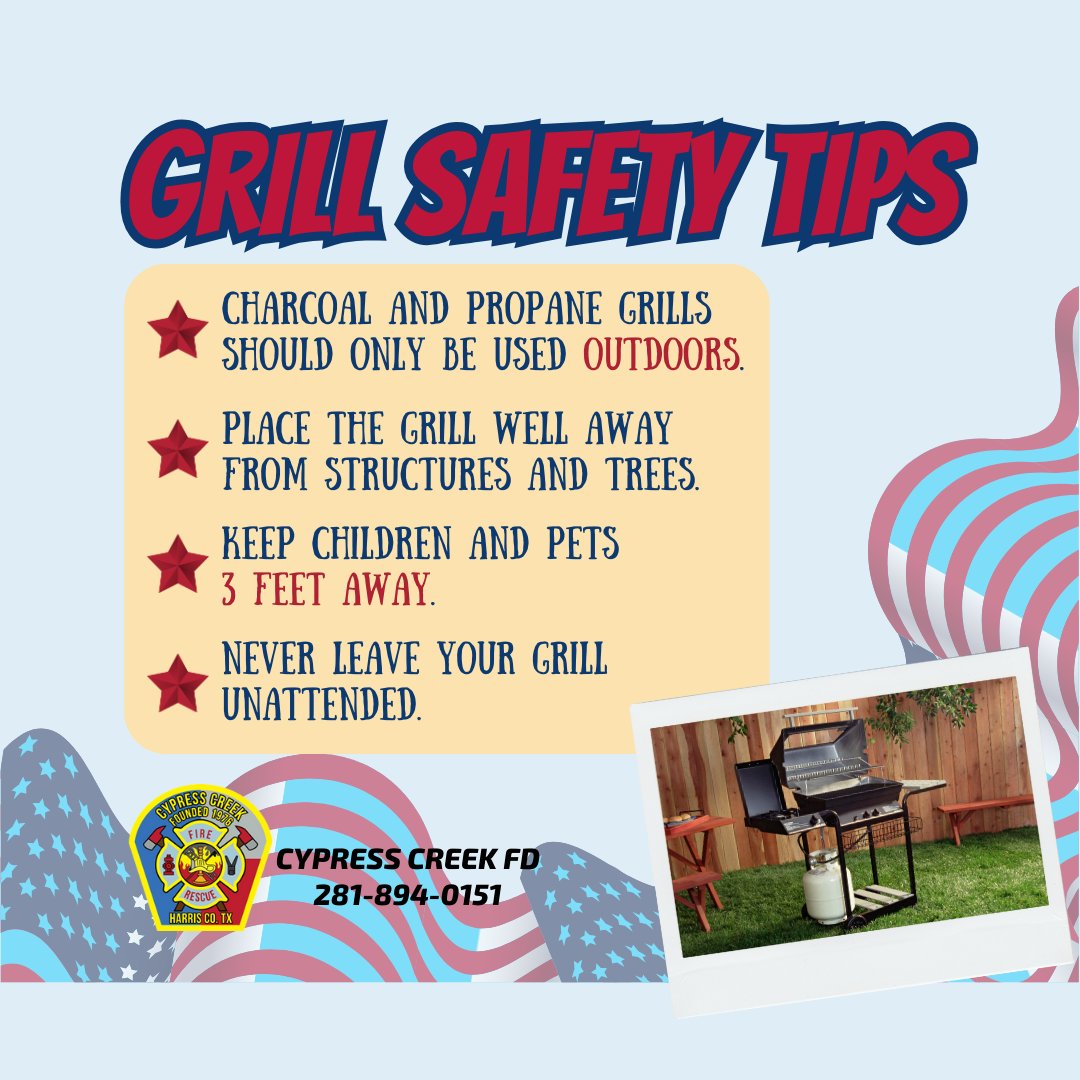 Firing up the grill this Memorial Day? 🇺🇸🔥 Keep it safe — grill away from your home, deck railings, and overhanging branches. Stay fire smart while you celebrate! #GrillSafety #MemorialDay #FireSafeFun #CypressCreekFD