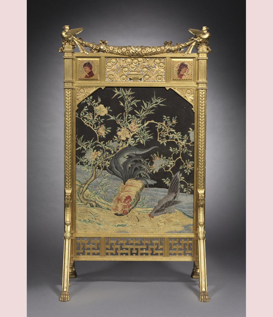Herter Brothers, fire screen, c. 1878-80. The panel of brocaded silk and embossed paper is likely a Japanese import, and follows traditional “bird and flower” painting composition. Cleveland Museum of Art. #antiqueoftheday #firescreen #screen #brocade #silk #japan