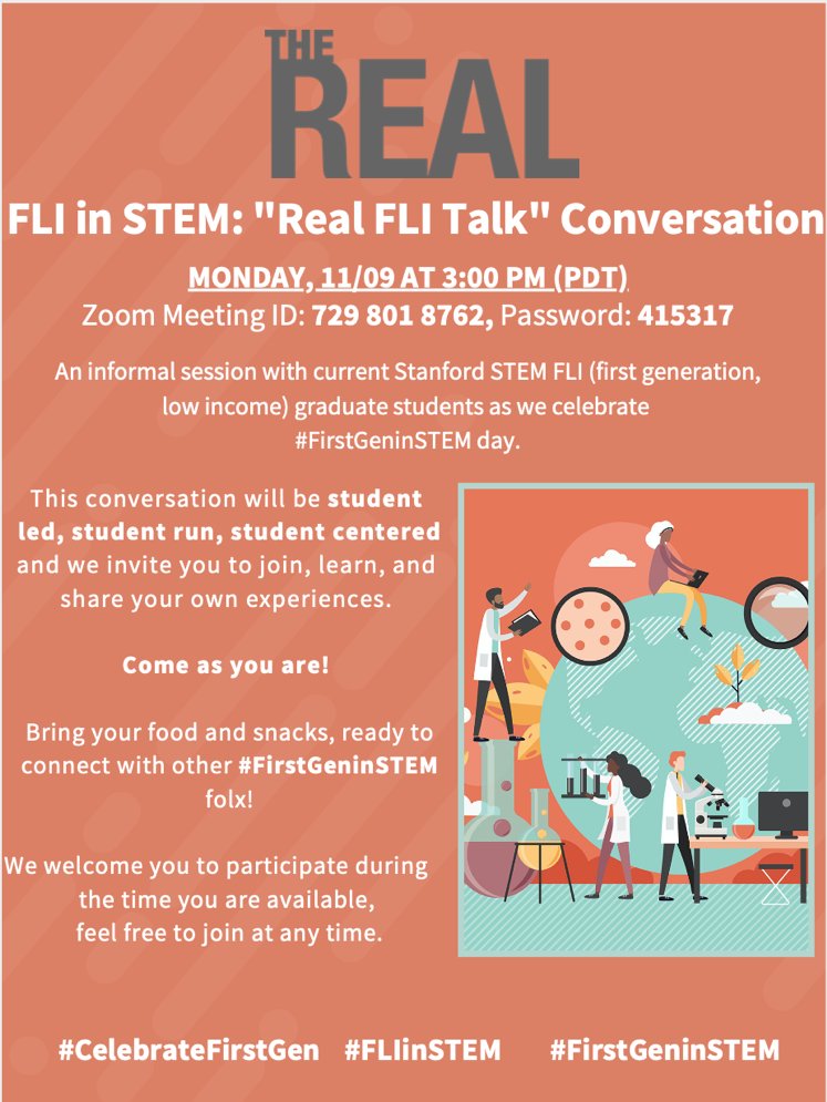 Real FLI Talk – Celebrating #FirstGenInSTEM with @StanfordEng and @StanfordBiosci on November 8, 2021 from 3:00 pm – 4:30 pm PT over Zoom. Register at tinyurl.com/FirstGenInSTEM. “Real FLI Talk” is our 2nd annual conversation that centers #FirstGenInSTEM people.