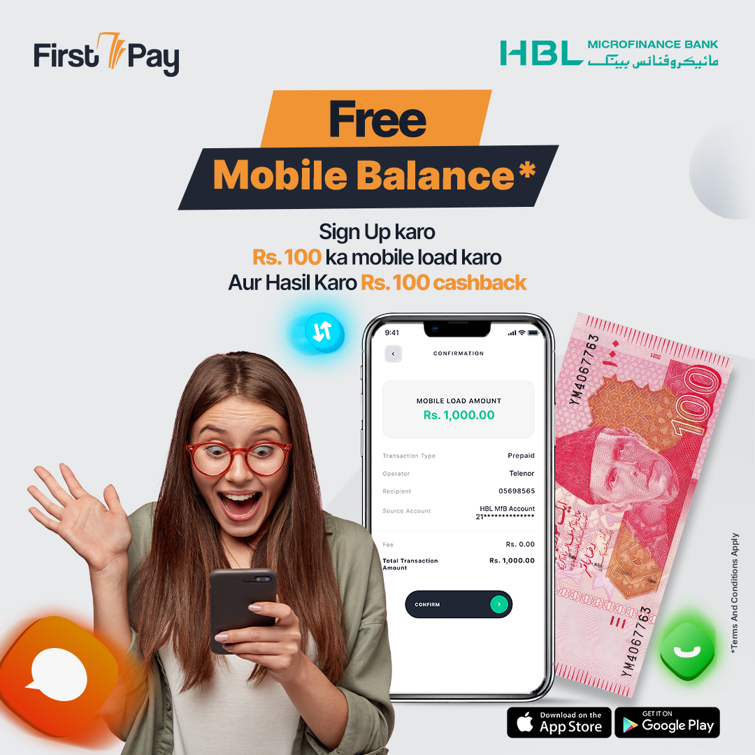 Load mobile balance and get cashback! Download FirstPay app, sign up and top-up Rs.100 to get Rs. 100 cashback! Download Now: onelink.to/hblmfbfp *T&Cs Apply: hblmfb.com/terms-and-cond… #FirstPay #FirstPayMobileWallet #Cashback #Rewards #FirstPayProfit