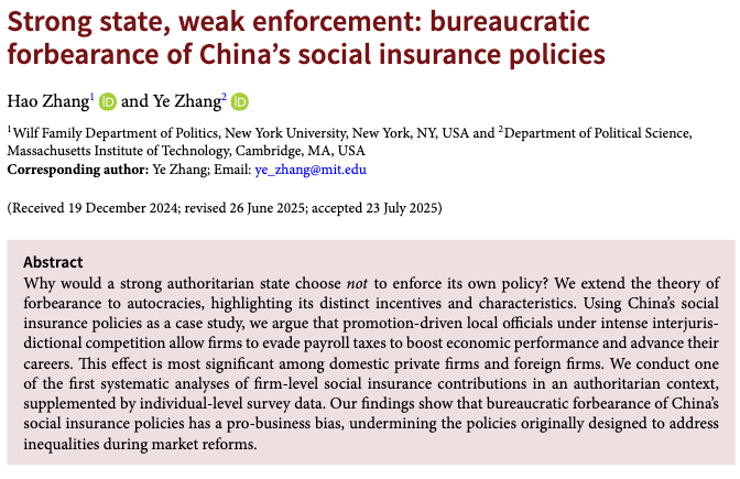 🏛️ Why would an authoritarian state not enforce its own policies? ➡️ Studying China’s social insurance system, @haozhang328 & @zhangye68 find that promotion incentives and competition lead local officials to tolerate firm payroll tax evasion cambridge.org/core/journals/… #FirstView