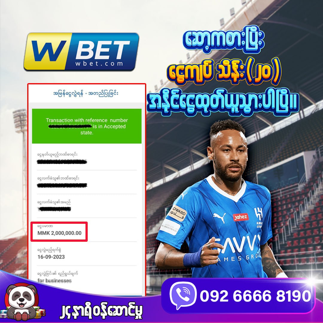 မင်္ဂလာပါရှင့် 🙏 🐼Panda99🐼 မှာ WBET ဂိမ်းဆော့ကစားပြီး အနိုင်ငွေကျပ် သိန်း(20) ထုတ်ယူသွားပြီနော် 😎 Congratulations ပါအကိုရေ 🤗🎉 🐼Panda99🐼 Telegram No. 📞 092 6666 8190 ကို အချိန်မရွေးဆက်သွယ်မေးမြန်းနိုင်ပါတယ်ရှင့် 💃🫶 #panda99 #WBET #FishGames #စလော့ #ကာစီနို #ဘောလုံး