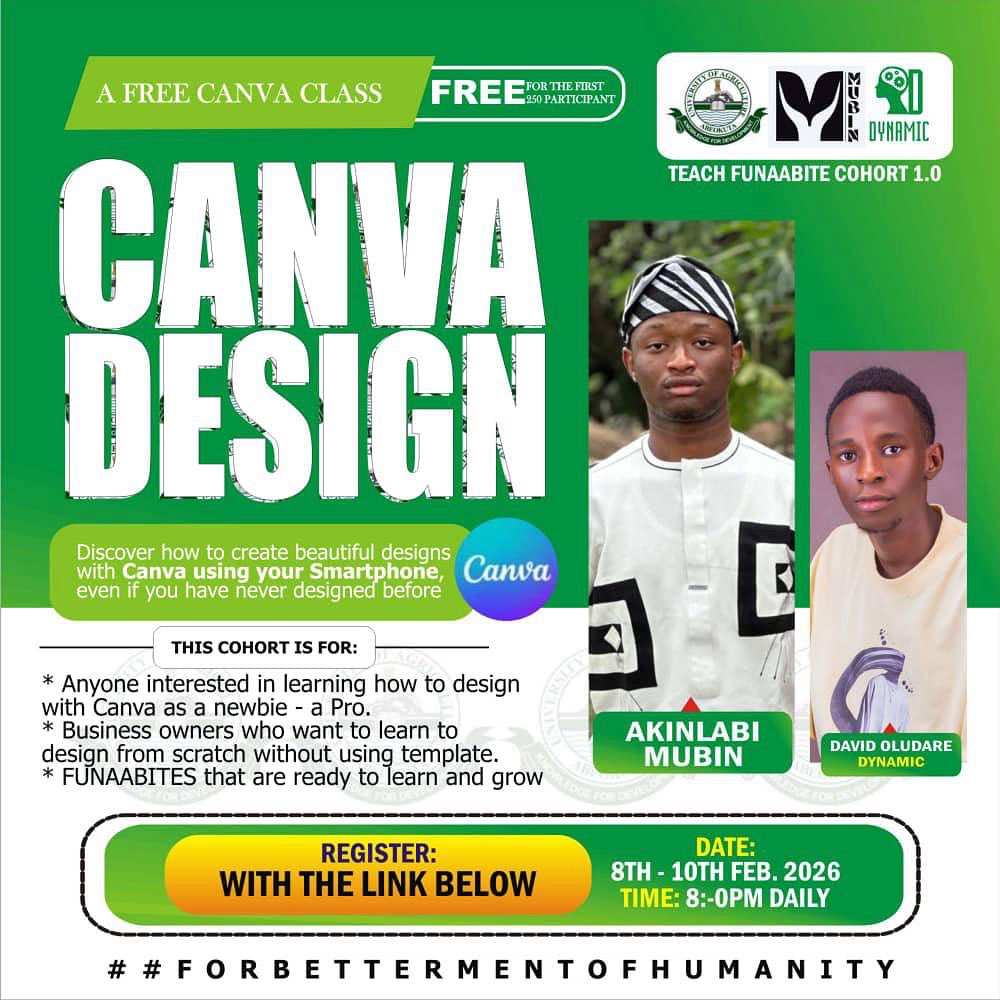 After the exams, my foundation, in partnership with Dynamic, will be organizing a free training for FUNAAB students on how to earn using Canva. This class promises to be highly informative, practical, and engaging. 📸 A FREE photography class is also coming very soon #ForHumanity