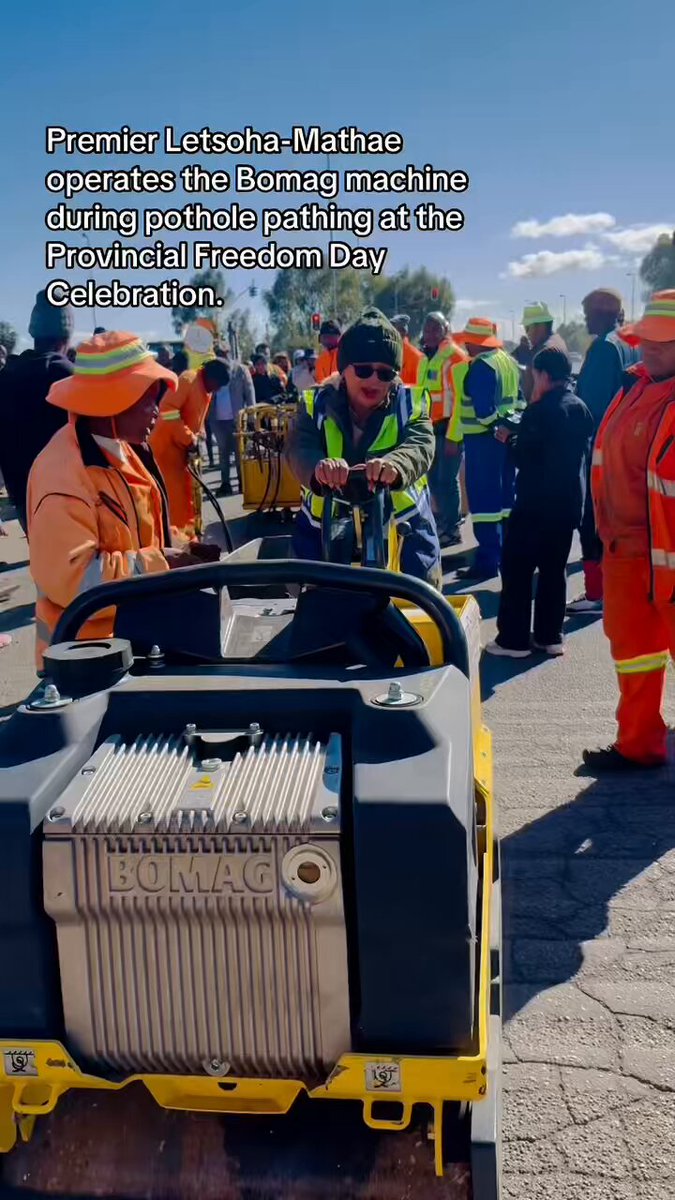Premier Letsoha-Mathae operates the Bomag machine during pothole pathing at the Provincial Freedom Day Celebration. #FreedomDay #FreedomInService