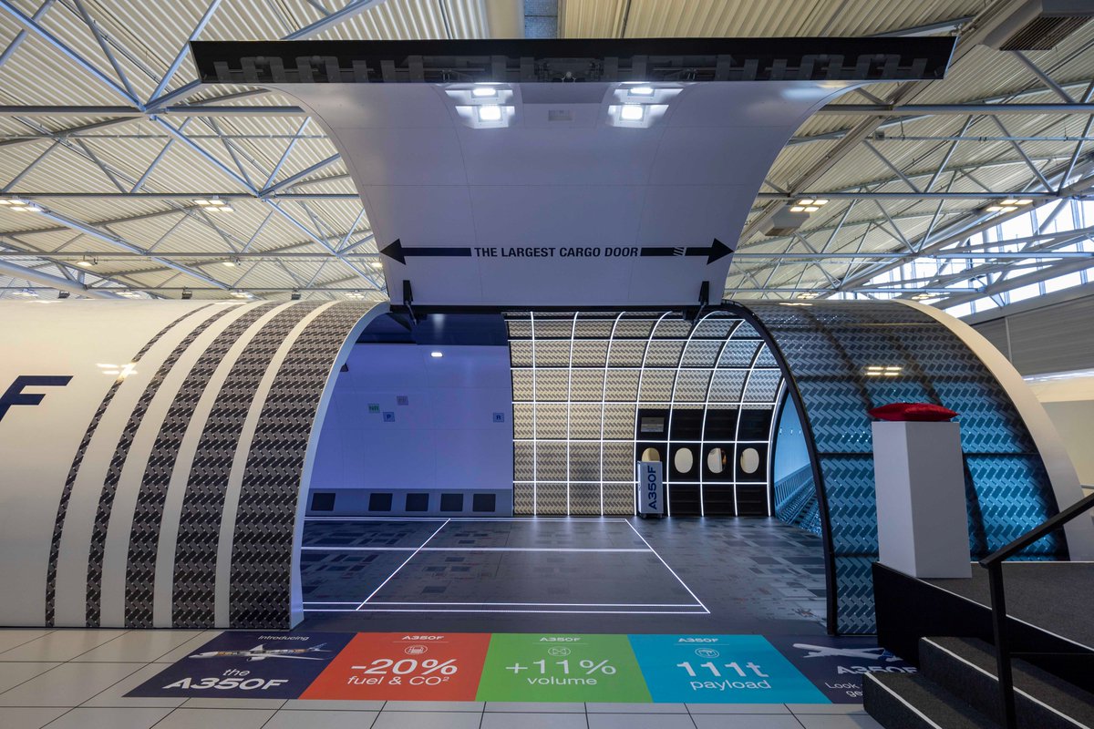 Welcome to the stunning #A350F state-of-the-art #freighter mock-up showcasing the world’s largest main deck cargo door! 🤩 Seeing is believing with this full-scale immersive installation designed to highlight its loading flexibility and incredible 111t payload capacity. ✈️