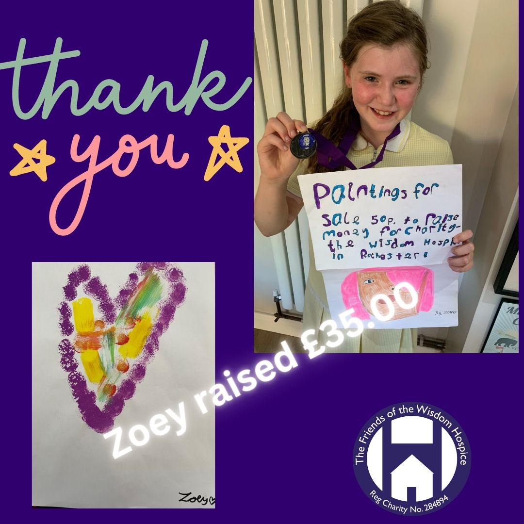 Our supporter Zoey made paintings and sold them for 50p raising £35.00 for The Hospice. Zoey also made a painting for staff and patients 💜 Thank you so much Zoey, we are all so grateful to you for your support 💗 #friendsofwisdom #supporter #fundraising #charity