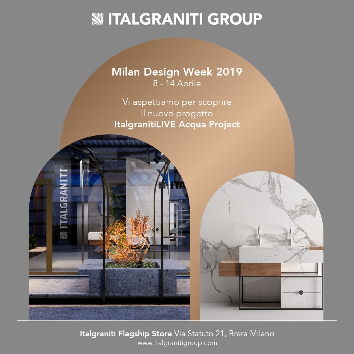 | 8/04 - 14/04 | - 1 week to Milan Design Week 2019 Meet us in Milan, in the heart of @Brera_District in via Statuto 21, at Italgraniti Flagship Store, to discover "ItalgranitiLIVE - Acqua Project" #fuorisalone19 #milandesignweek2019 #fuorisalone