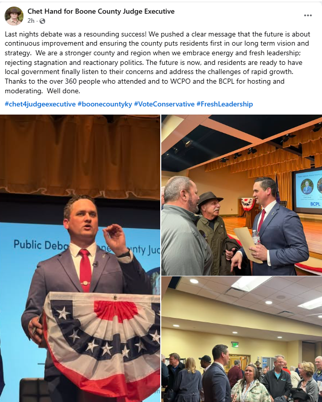 Kudos to WCPO and the BCPL for a well-run professional debate! Congratulations to @chet_hand for Boone County Judge Executive for a very well-spoken presentation of his plan for the FUTURE of Boone County and its residents. #FutureIsNow #FreshVision