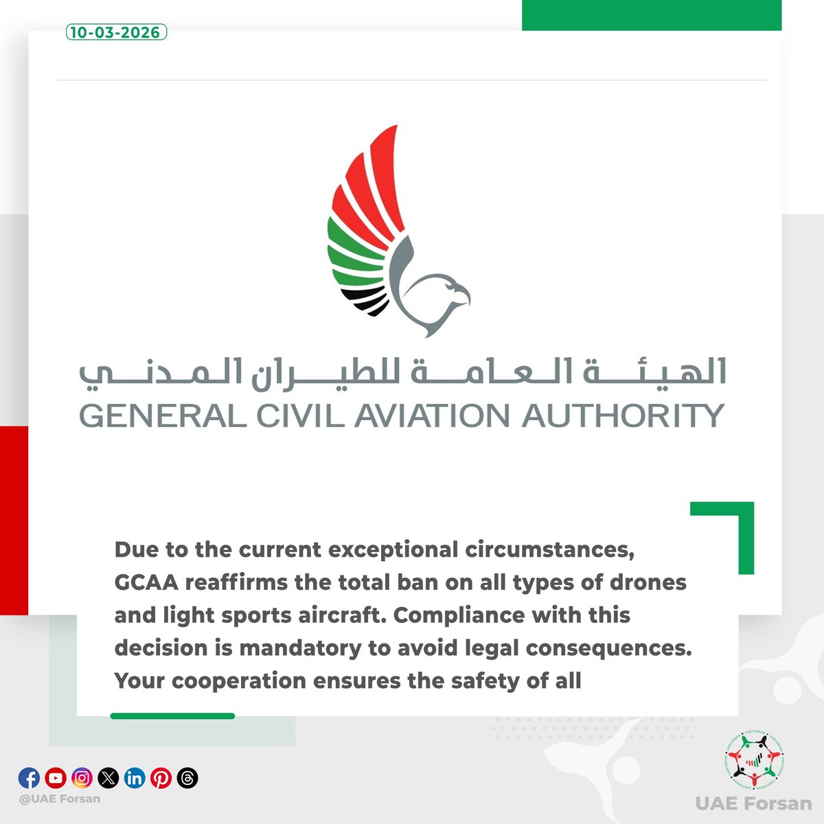 Due to the current exceptional circumstances, GCAA reaffirms the total ban on all types of drones and light sports aircraft. Compliance with this decision is mandatory to avoid legal consequences. Your cooperation ensures the safety of all #UAE #GCAA #UAEisSafe