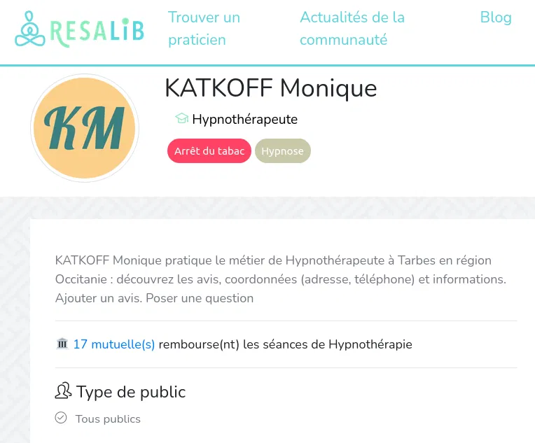 La veuve de #NicolasKatkoff, l'anésthésiste (#REAA #GLDF) de Trébons est originaire d'Amiens et exerce la thérapie par l'#hypnose à Tarbes. Elle soutient #EnMarche et fréquente la chocolaterie Trogneux, qu'elle recommande sur la page de Jean Trogneux .