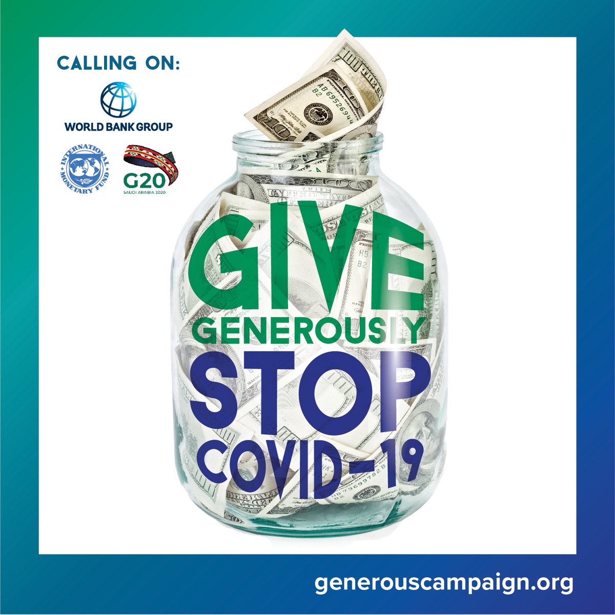 Help us get maximum #COVID19 relief to developing countries! Join the #GenerousCampaign by urging the @G20org, IMF/@KGeorgieva and @WorldBank to #SaveLives by #GiveGenerously to the countries hardest hit by the virus!