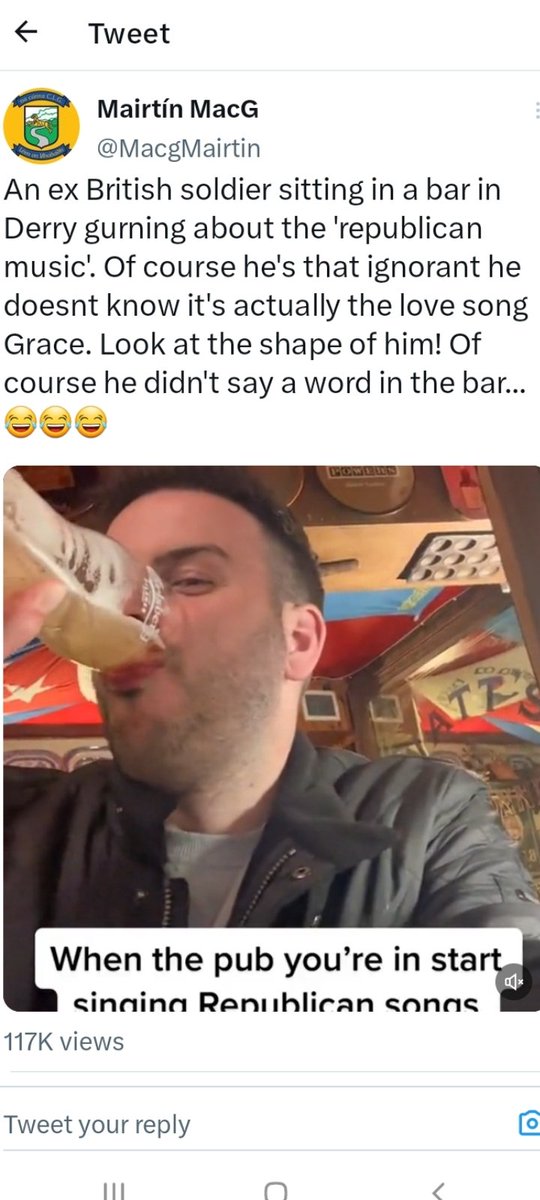 Don't let the fact he doesn't claim to be an ex British soldier... or claims he's even British get in the way of the Greysteel bigot labelling this fella... It only says he's been to sites where British forces fought.... #gettingdesperate