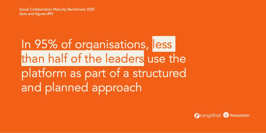 In 95% of organisations, less than half of the leaders use the platform as part of a structured and planned approach. bit.ly/3jaObUx #maturityscan #globalbenchmark #globalreport #ESN #socialcollaboration #internalcommunication #intranet #orangetrail #facts