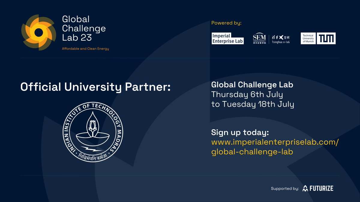 We are excited to announce that @iitmadras is an official partner at the Global Challenge Lab 2023! Spaces are limited, so find out more and register at imperialenterpriselab.com/global-challen… For queries, call 044 22574928 or visit us! #officeofglobalengagement #IITMadras #globalchallengelab