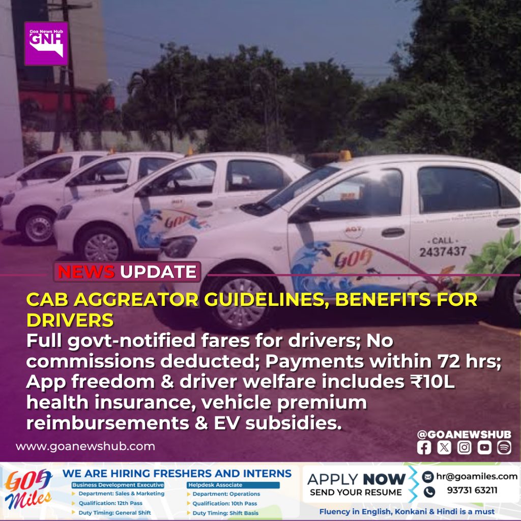 CAB AGGREATOR GUIDELINES, BENEFITS FOR DRIVERS Full govt-notified fares for drivers; No commissions deducted; Payments within 72 hrs; App freedom & driver welfare Includes ₹10L health insurance, vehicle premium reimbursements & EV subsidies. #GoaMobility #DriverWelfare