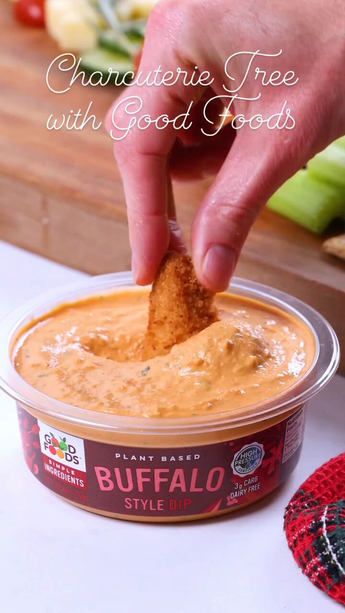 The holidays just got a whole lot tastier! ✅ Try this fun charcuterie tree with Good Foods Group, LLC dips and guacs - so easy & so festive! #HPPCertified #HighPressureProcessing